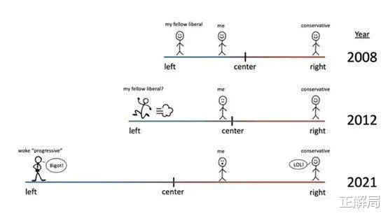 左派越走越远导致原先的中间派成为右派,图片来自马斯克自己的分析