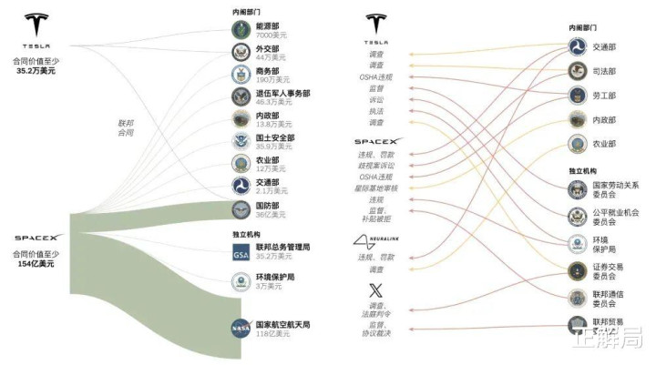还有人工智能公司xAI、隧道建设公司The Boring Co、脑机接口企业Neuralink还有X(前身Twitter),无不和政府发生了千丝万缕的联系,又面临千姿百态的监管。